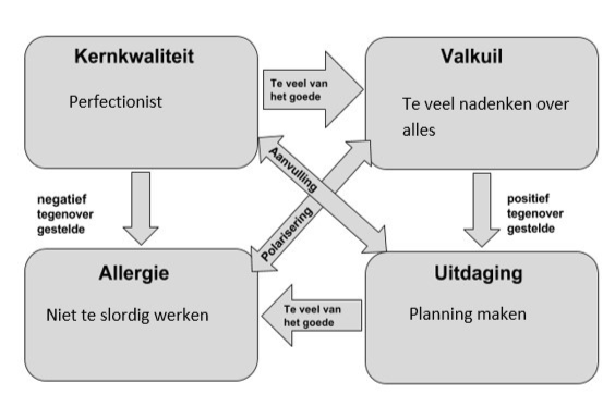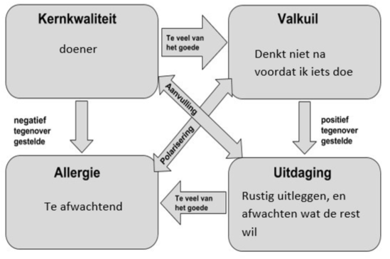 In de les moesten we ook opzoeken wat de Kernkwadranten van Daniel D. Ofman waren. Ik kwam er achter dat dit schema’s waren, waarin je jouw kwaliteiten moest invullen. Doordat je dit schema invulde kwam je er achter dat je positieve eigenschappen niet altijd positief hoeven te zijn. Ik heb hier mijn 4 kern eigenschappen ingevuld en ik vond het erg interessant om te zien wat mijn valkuilen konden zijn.