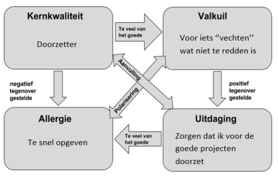 In de les heb ik geleerd wat de kernkwadranten van Daniel Ofman zijn en ben ik hiermee aan de slag gegaan. Onderstaand zie je 3 kernkwadranten, die ik heb uitgewerkt door mijn belangrijkste kwaliteiten te gebruiken.